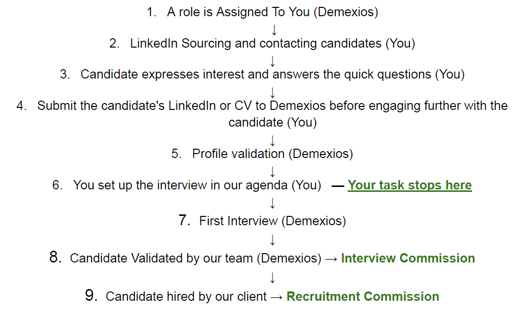 For this collaboration to be successful, we generally expect a minimum of 3 qualified candidates per week for hard-to-fill roles, and at least 4 candidates per week for moderately difficult roles. In practice, this typically requires between 1.5 and 3 hours per day dedicated to sourcing activities.